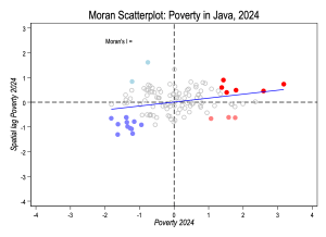 I updated the map using Github to host the HTML file map. This chart shows the LISA scatter of poverty in Central Java Province, Indonesia, in 2022. The four quadrants represent the High-High, High-Low, Low-High, and Low-Low poverty clusters. Using the weight queen matrix, four regions are included in the high-high poverty cluster in Central Java in 2022: Kebumen (my hometown), Banyumas, Wonosobo, and Purworejo. I also added a map… Read more: LISA Map Poverty of Central Java- Indonesia, 2022