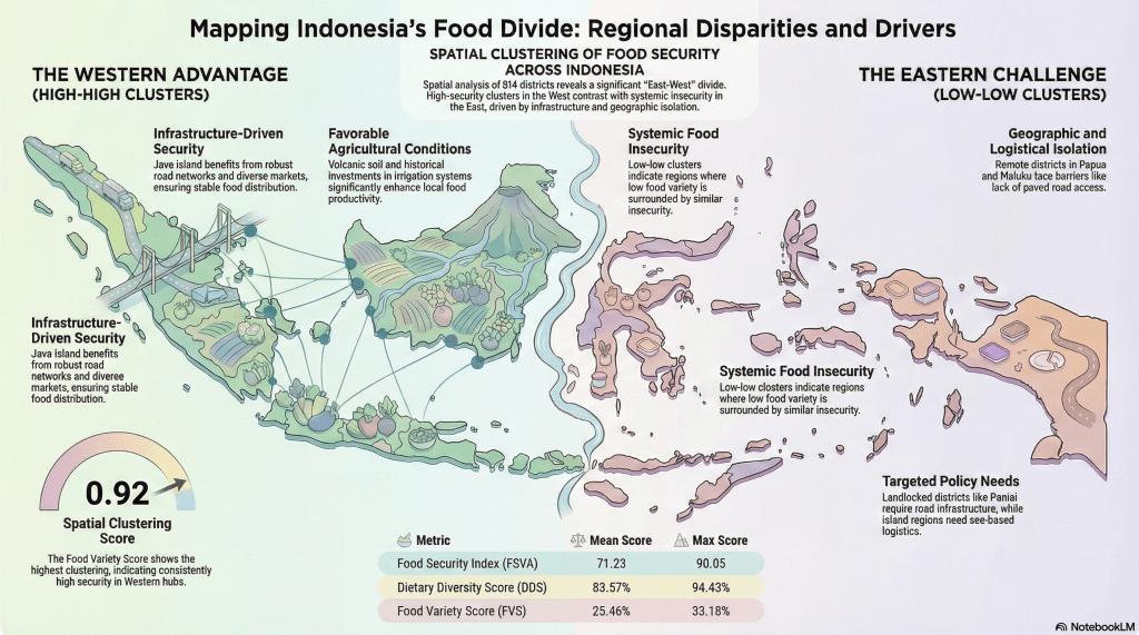The Prosperous West. The island of Java is a “hotspot” for food security. The study calls these areas “High-High” clusters. Java benefits from fertile soil due to volcanic mountains and excellent infrastructure. Good roads make it easy to distribute food, and strong markets offer diverse products.